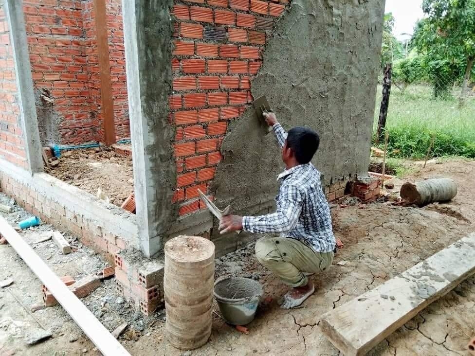 เริ่มงานฉาบปูน. สังเกตนั่งร้านกัมพูชา